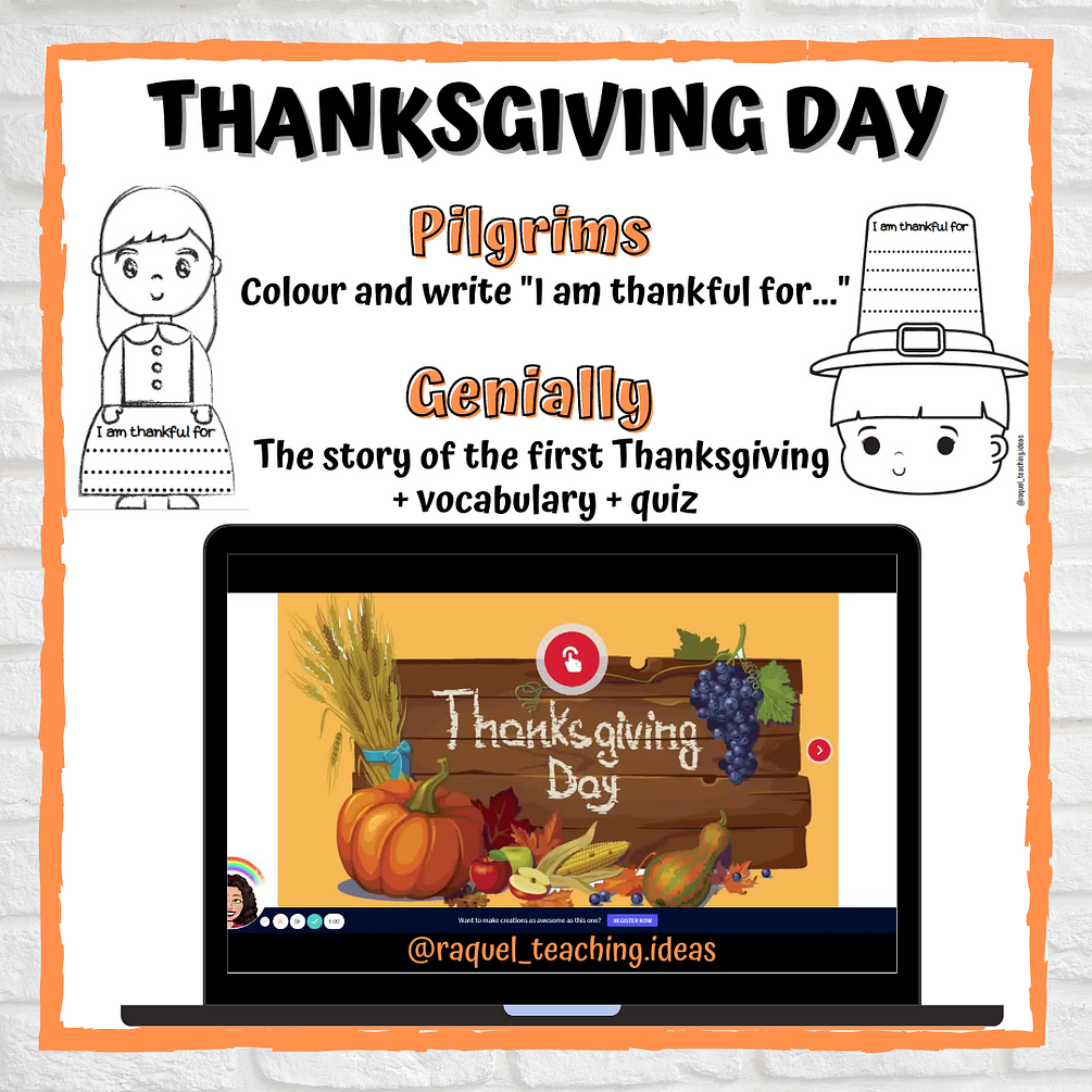 Thanksgiving pilgrims + Genially (story + vocabulary + quiz).